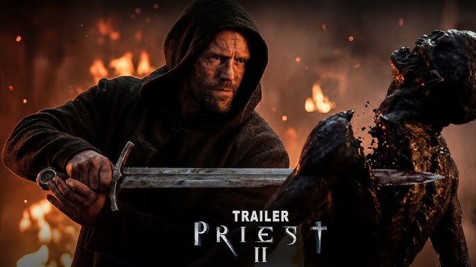 Title at bottom: ‘PRIEST 2’ in bold metallic silver font with cracks and glowing edges. Subtitle beneath: ‘THE LAST SANCTUARY’. Tagline at top: ‘FAITH WILL BE TESTED. DARKNESS WILL FALL.’