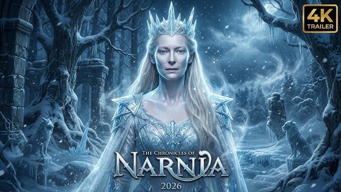 “Ultra-realistic cinematic movie poster for an epic dark fantasy film titled ‘NARNIA: THE GLACIAL PROTOCOL’. A विशाल frozen kingdom of Narnia under an eternal winter storm, विशाल icy mountains and a shattered magical castle made of crystal ice glowing faintly blue. Snow is blowing violently across the scene, creating a harsh, unforgiving atmosphere.
