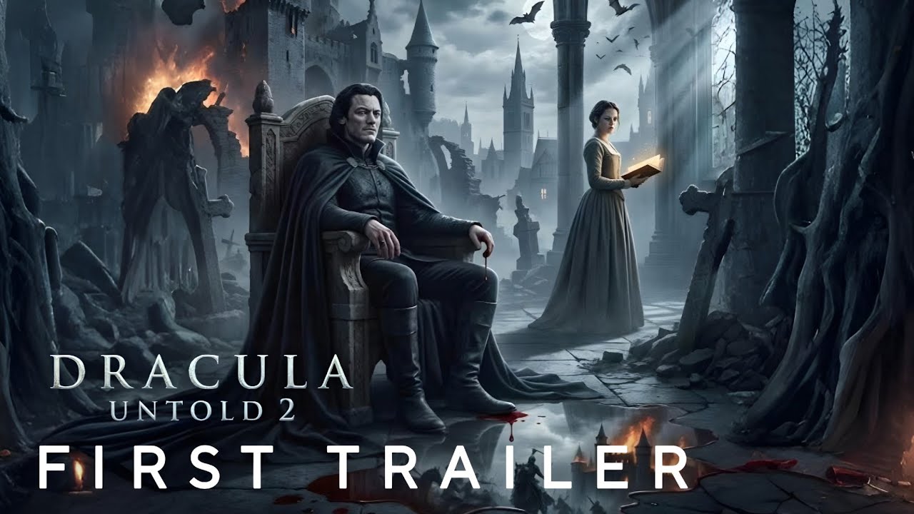 “Ultra-realistic cinematic movie poster for a dark gothic fantasy film titled ‘DRACULA UNTOLD 2: ETERNAL REIGN’. A vast, storm-covered medieval landscape under a blood-red moon. At the center, a towering gothic castle sits on a jagged cliff, lightning striking behind it, illuminating the sky with violent flashes. Thick fog rolls through the valley below.